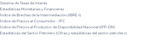 Sistema de Tasas de Interés Estadísticas Monetarias y Financieras Índice de Brechas de la Intermediación (IBRE-I) Índice de Precios al Consumidor - IPC Índice de Precios al Productor de Disponibilidad Nacional (IPP-DN) Estadísticas del Sector Petrolero (Cifras y estadísticas del sector petrolero) BCE BCE INEC INEC INEC BCE semanal semanal mensual mensual mensual mensual