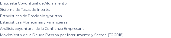 Encuesta Coyuntural de Alojamiento Sistema de Tasas de Interés Estadísticas de Precios Mayoristas Estadísticas Monetarias y Financieras Análisis coyuntural de la Confianza Empresarial Movimiento de la Deuda Externa por Instrumento y Sector (T2 2018) MINTUR BCE MAG BCE BCE BCE mensual semanal quincenal semanal mensual trimestral