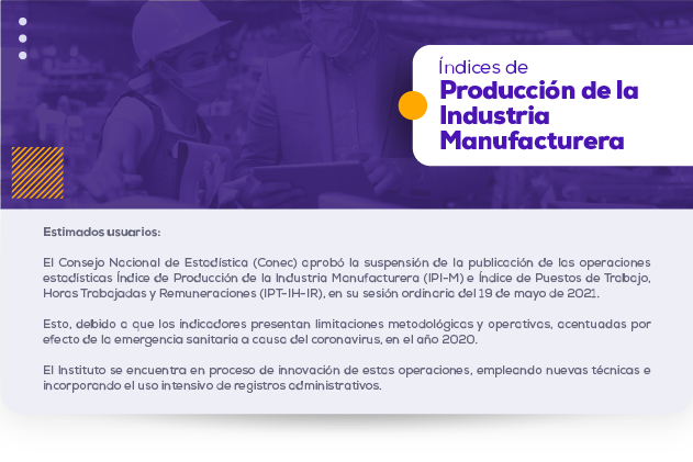 El Índice de Producción de la Industria Manufacturera (IPI-M Base 2015=100) es un indicador que mide el comportamiento, en la coyuntura nacional, de la producción generada por la industria manufacturera en el corto plazo. Se determina a partir del valor de ventas y la variación de existencias, de los bienes producidos en cada uno de los establecimientos manufactureros en el Ecuador. Este indicador forma parte del Sistema de Indicadores de la Producción (SIPRO), considerado como una innovación estadística para estandarizar y homologar conceptos, metodologías y procesos investigativos, en el marco de las buenas prácticas internacionales para la generación de números índices.